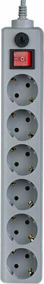 Cетевой фильтр, количество розеток - 6 (евростандарт с заземлением), номинальный ток нагрузки - 10А, номинальное входное напряжение - 220В, корпус из ударопрочного негорючего материала, длина кабеля - 1,8 м.