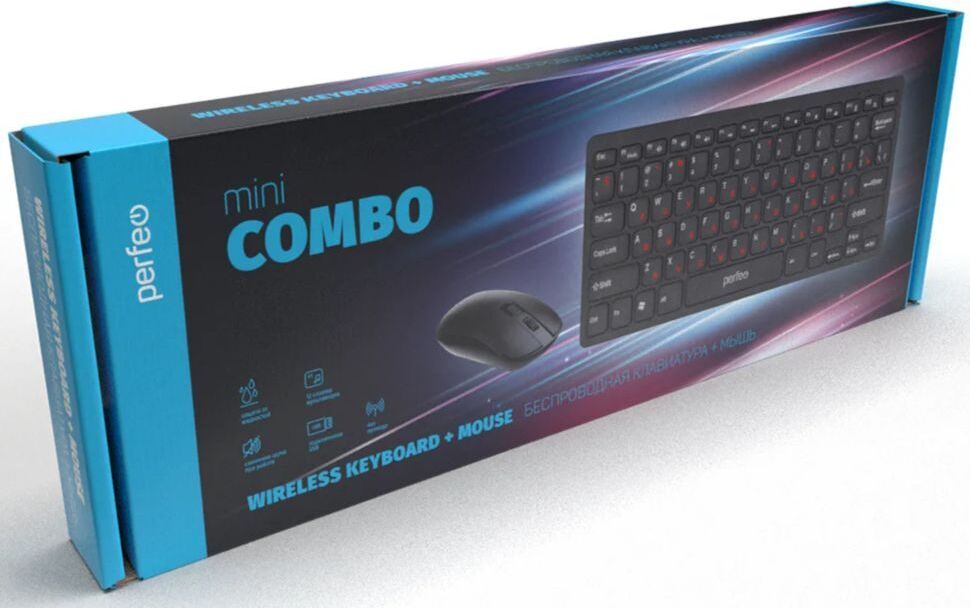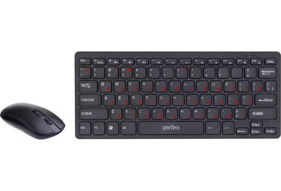 Набор (клавиатура+мышь) беспроводной, интерфейс USB; клавиатура - количество клавиш - 78, функциональных - 12; мышь - оптическая, количество кнопок - 4, колесо прокрутки, изменяемое разрешение сенсора - 1000/1200/1600 dpi, радиус действия - до 10 м.