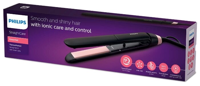 PHILIPS BHS378/00 Неотразимая укладка Система ионизации для гладких, блестящих волос Температурный диапазон от 160 °C до 230 °C. Бережный уход за волосами Технология ThermoProtect Керамические пластины с кератиновым покрытием легко скользят по волосам, придавая блеск Удобство использования 6 температурных режимов с LED-индикацией для полного контроля Длинные пластины 100 мм для быстрого и удобного выпрямления Быстрый нагрев, готовность к использованию через 30 секунд Функция автоотключения для безопасного использования Функция блокировки пластин для для безопасности и удобства хранения Переключение напряжения — удобен для поездок и путешествий