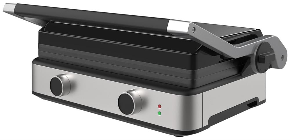Мощность: 2000Вт Безопасная не нагревающаяся ручка Регулировка температуры Индикатор включения Индикатор нагрева Съемные нагревательные панели увеличенного размера Размер панели (мм): 370х230 Антипригарное покрытие нагревательных панелей Три рабочих положения: пресс /105° / 180° Лоток для сбора жира Противоскользящие ножки