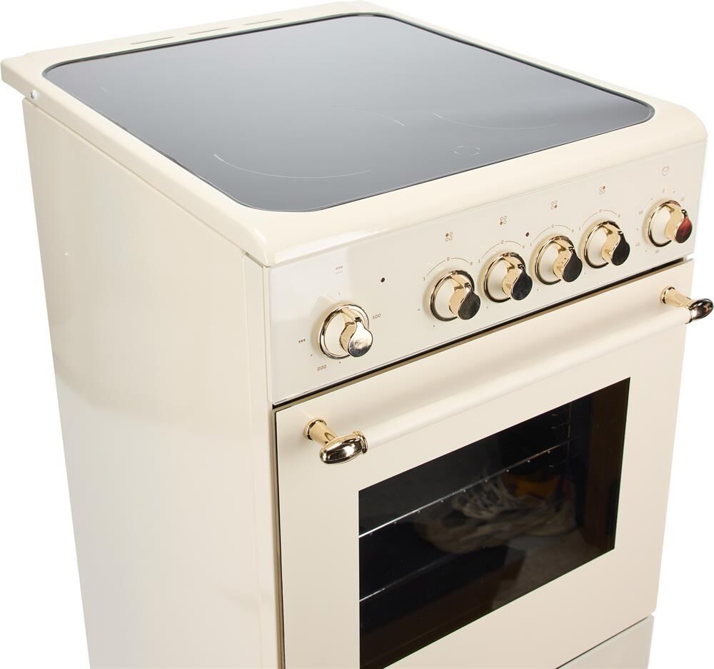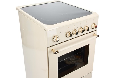 Стеклянный фасад, стеклокерамическая плоскость готовки, типоразмер 50*60см, 2 электроконфорки 1,2кВт, 2 электроконфорки 1,7кВт, индикатор остаточного тепла, электродвигатель, таймер механический, объем электрошкафа - 60л., единовременно потребляемая мощно