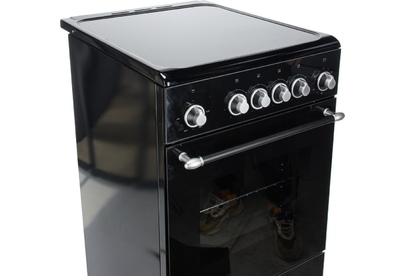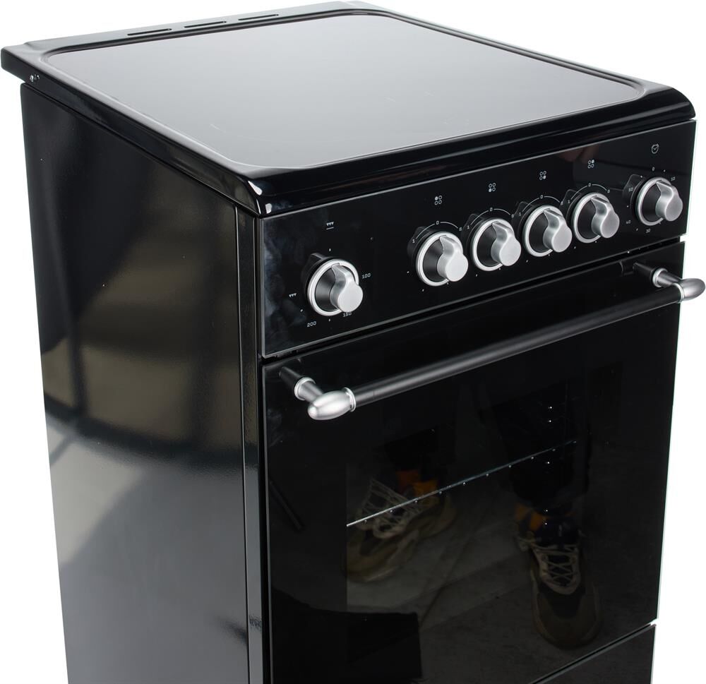 Стеклянный фасад, стеклокерамическая плоскость готовки, типоразмер 50*60см, 2 электроконфорки 1,2кВт, 2 электроконфорки 1,7кВт, индикатор остаточного тепла, электродвигатель, таймер механический, объем электрошкафа - 60л., единовременно потребляемая мощно