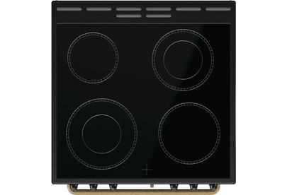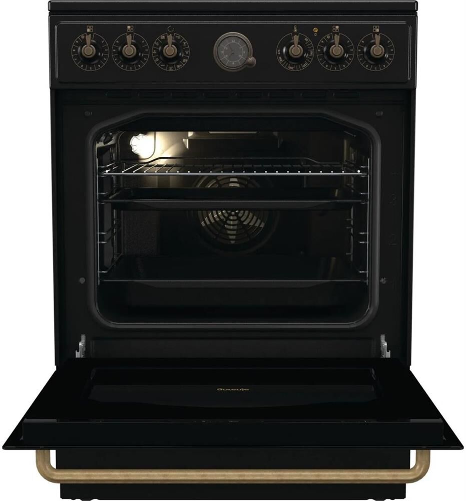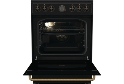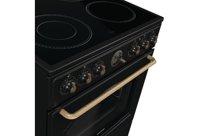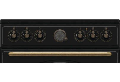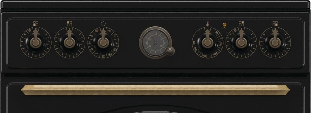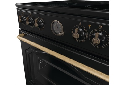 Электронный программатор с аналоговым дисплеем, Стеклокерамическая плита, Габаритные размеры (шхвхг): 60 ? 85 ? 60 см, Класс энергопотребления: A, Материал панели управления: Крашеный металл, Цвет: Черный, Цвет ручки: Бронзовый, Материал дверцы: Стеклянна