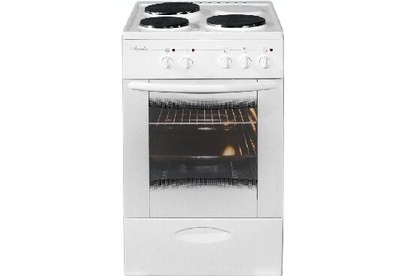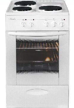 (ВхШхГ) 85х50х60см. 3 электр. конфорки. Духовка электрич. Объем 60л. Очистка духовки традиционная. Подсветка духовки. 2 стекла дверцы духовки. Выдвижной ящик для принадлежностей. Цвет белый. Стекл. крышка стола.