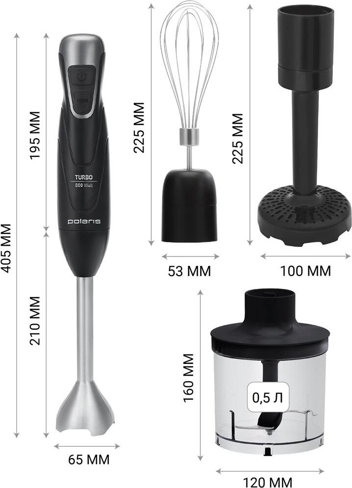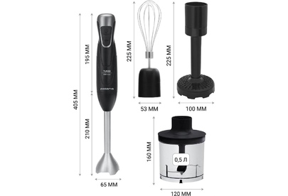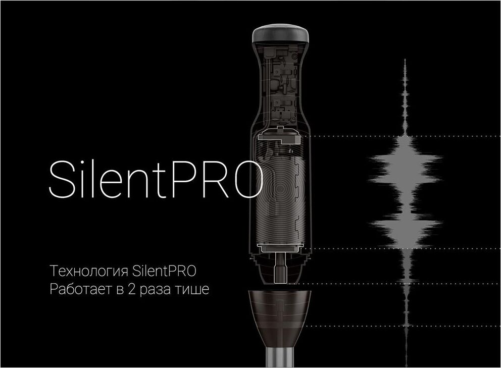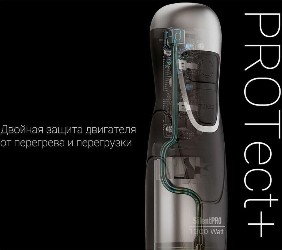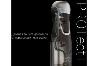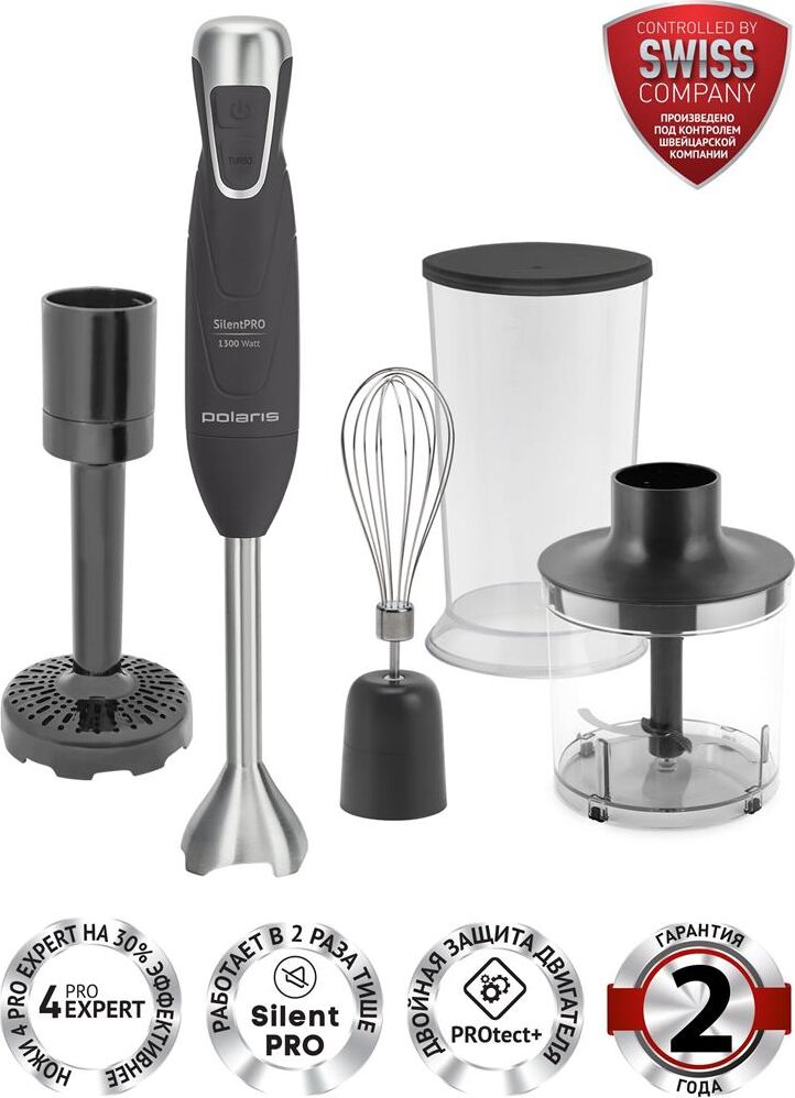 Тип: погружной. Мощность: 1300. Количество скоростей/режимов: 2. Турборежим: есть. Измельчитель: в комплекте. Венчик для взбивания: в комплекте. Материал погружной части: нержавеющая сталь. Электропитание: от сети. Регулировка скорости вращения: есть. Регулятор скорости вращения: плавный, бесступенчатый. Материал ножей: нержавеющая сталь. Другие насадки: насадка-блендер, насадка для пюре. Мойка в посудомоечной машине: да, можно мыть съемные части. Мерный стакан: есть. Длина сетевого шнура: 1.5. Защита от перегрузки: есть. Материал корпуса: нержавеющая сталь/пластик. Вес товара: 1.44. Режим измельчения: есть. Особенности: Технология SilentPRO: работает в 2 раза тише. Технология PROtect+ двойная защита двигателя (от перегрева и перегрузки) обеспечивает надежность и долговечность.. Габариты упаковки (ед) ДхШхВ: 0.15x0.23x0.26. Вес упаковки (ед): 1.47. Страна производства: Китай. Гарантия: 24 мес.. Размеры (ШхВхГ): 65 х 405 х 65 мм. Цвет: черный/серебристый. Материал погружной части: нержавеющая сталь. Особенност