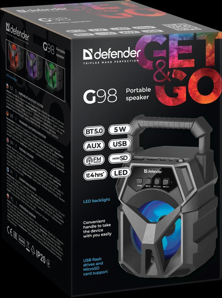 Портативная колонка, Bluetooth 5.0, мощность (RMS) - 5 Вт, диапазон частот 100–16000 Гц, соотношение сигнал/шум - 85 дБ, время работы от аккумулятора 4 час, интерфейс AUX-аудиовход, Питание USB, 5 В , Li-Ion аккумулятор, емкость аккумулятора - 1200 мА·ч, встроенный FM-приемник, радиочастотный диапазон 87.5–108.0 МГц, поддержка USB-накопителей и MicroSD-карт, светодиодная подсветка.