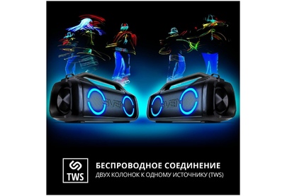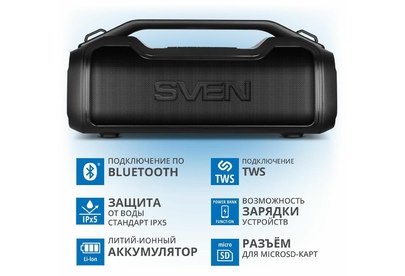 Портативная акустика SVEN PS-390, черный, акустическая система 2.0, мощность 2x25 Вт (RMS), Waterproof (IPx5), TWS, Bluet