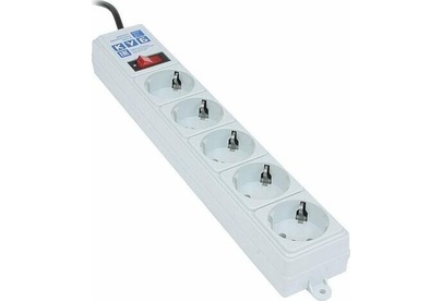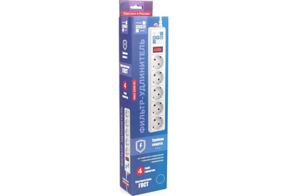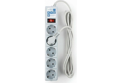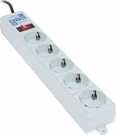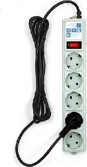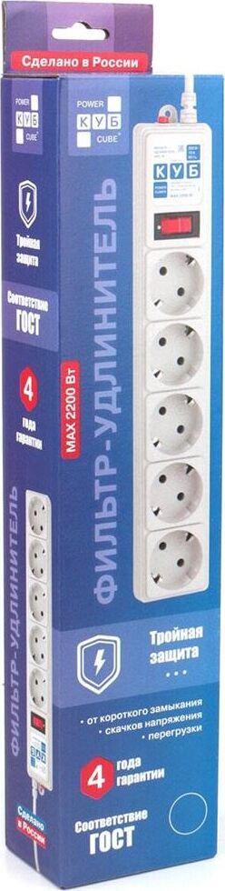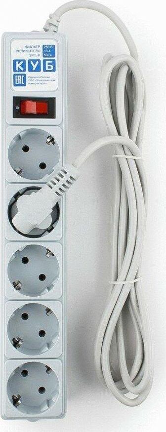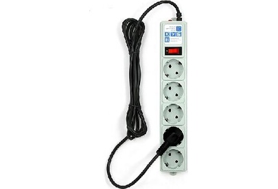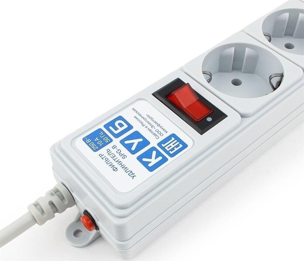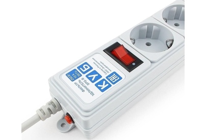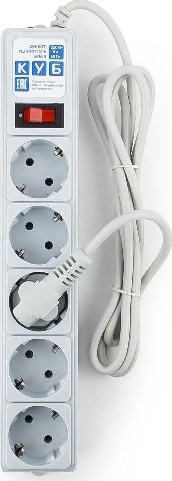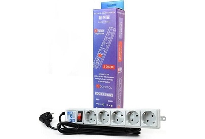 защита от импульсн помех, короткого замык и перегрузок, 220В, макс ток нагрузки 10А, макс поглощ энергия 90Дж, кабель ПВС-ВП 3х0.75мм2, Выключ – со светодиод индикац и коммутац двух проводников (фазы и нуля), 5 заземл евро-розеток, корпус – негорючий плас