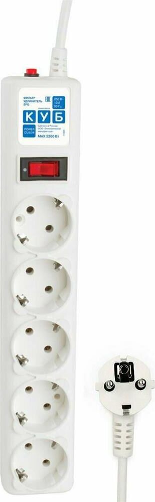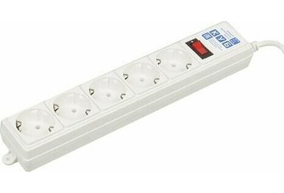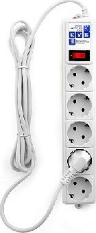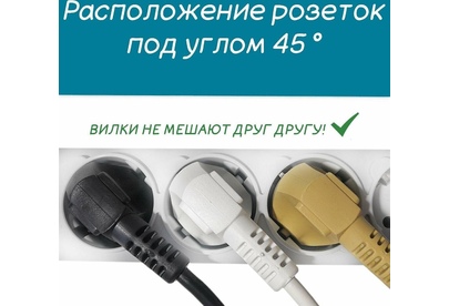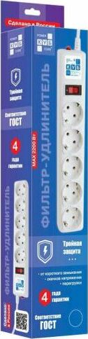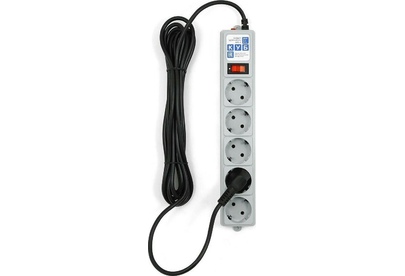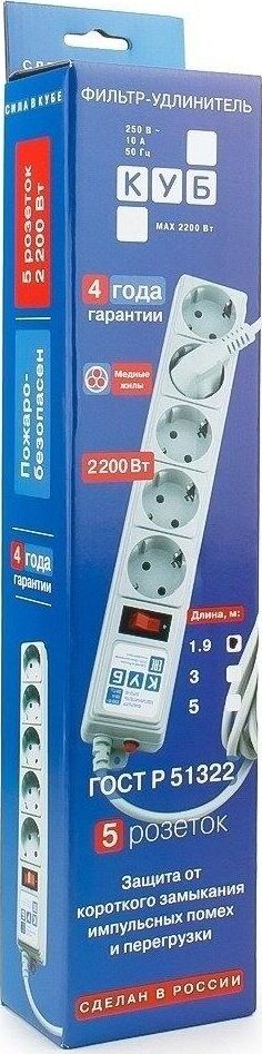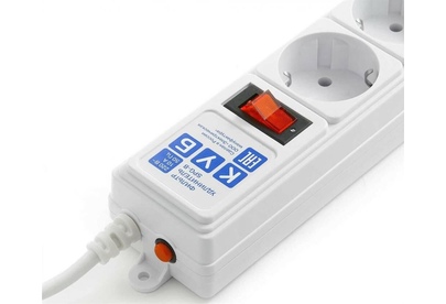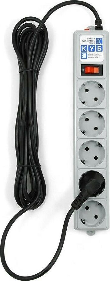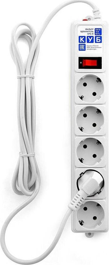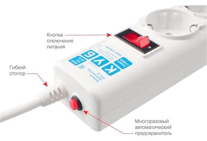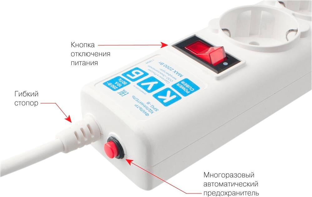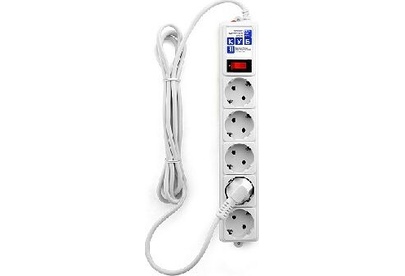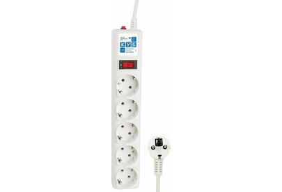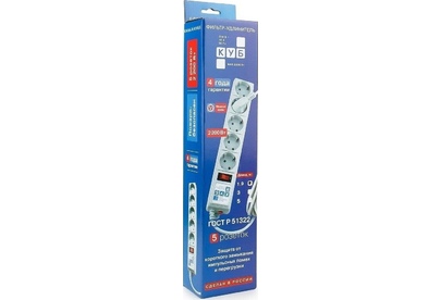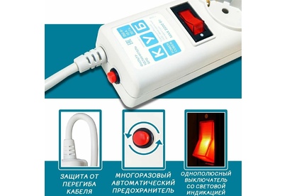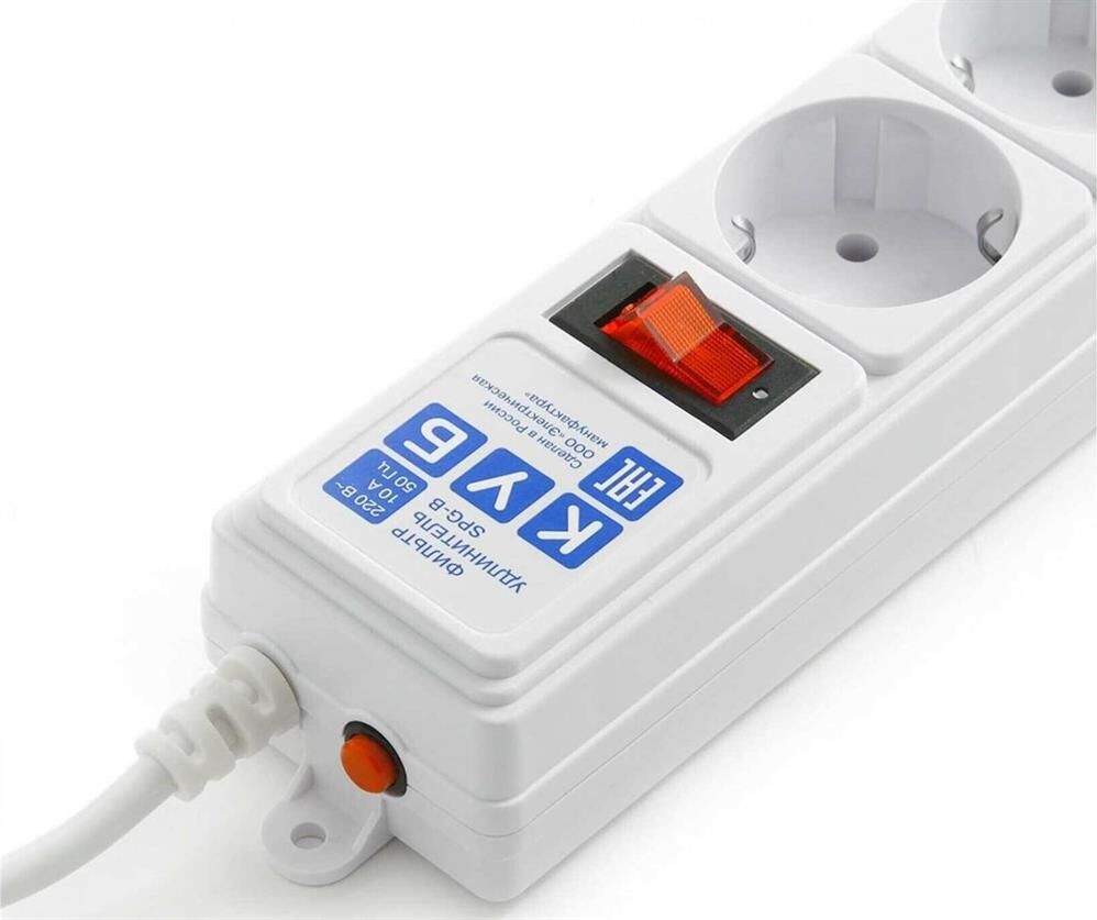 защита от импульсн помех, короткого замык и перегрузок, 220В, макс ток нагрузки 10А, макс поглощ энергия 90Дж, кабель ПВС-ВП 3х0.75мм2, Выключ – со светодиод индикац и коммутац двух проводников (фазы и нуля), 5 заземл евро-розеток, корпус – негорючий плас
