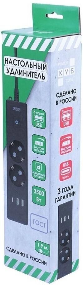 POWERCUBE Сетевой удлинитель PC-5B-2M 1.9м (2 розетки) черный (коробка)