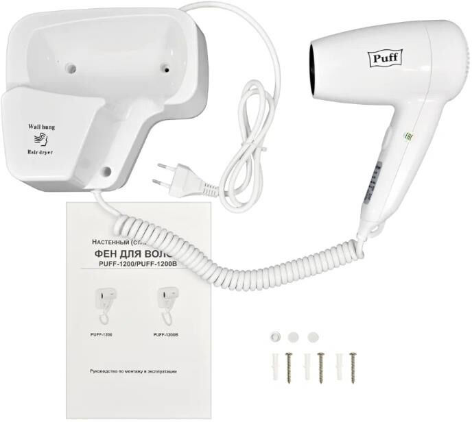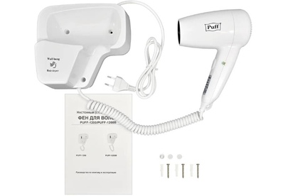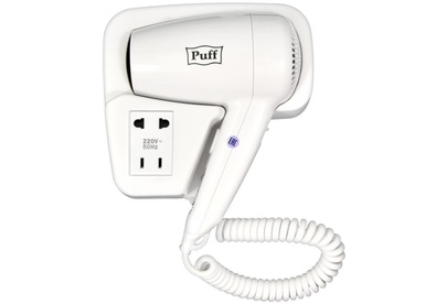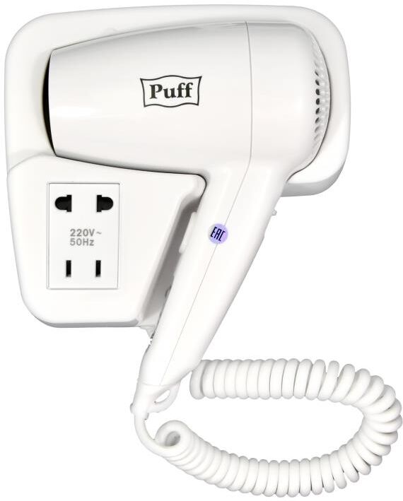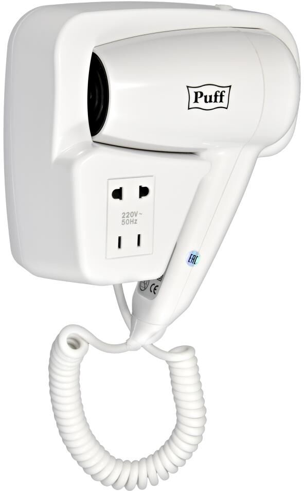 PUFF Фен для волос настенный " -1200B", белый, 1,2 кВт, с доп. розеткой
