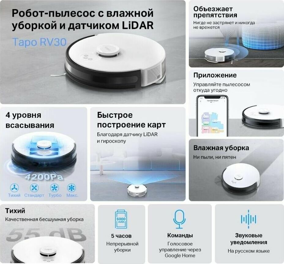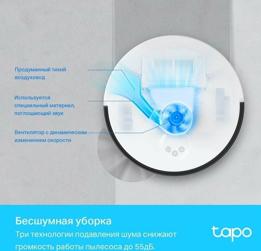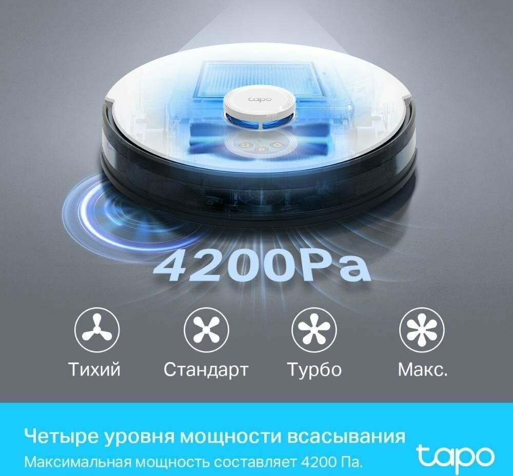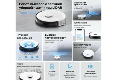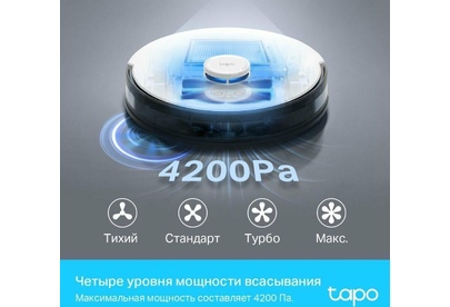 Мощность: 40. Мощность всасывания (Вт): 40. Объем пылесборника: 0.4. Регулировка мощности: в приложении. Общее количество насадок: 1. Бак для чистой воды: 0.3. Особенности: свои настройки для разных комнат, уборка по расписанию, точечная уборка, виртуальная стена, запретные зоны, низкий уровень шума (55 дБ), управление с помощью своих голосовых команд (Google Ассистент, Alexa), приложение Tapo. Тип электропитания: от аккумулятора. Емкость аккумулятора: 5000. Площадь уборки от одного заряда: 360. Уровень шума: 55. Дополнительные датчики робота-пылесоса: датчик падения. Габариты упаковки (ед) ДхШхВ: 0.521x0.16x0.435. Вес упаковки (ед): 6.3. Мобильное приложение: Tapo. Часть умного дома: да. Турборежим: есть. Зарядка робота-пылесоса: док-станция. Тип вилки: Тип C (Европейская без заземления). Частота электросети: 50 - 60 Гц. Мощность всасывания (Па): 4200. Количество боковых щеток: 1. Количество основных щеток: 1. Высота преодоления порога: 2. Форма робота-пылесоса: круглый. Гарантия: 12 мес.. Время заряда: 180