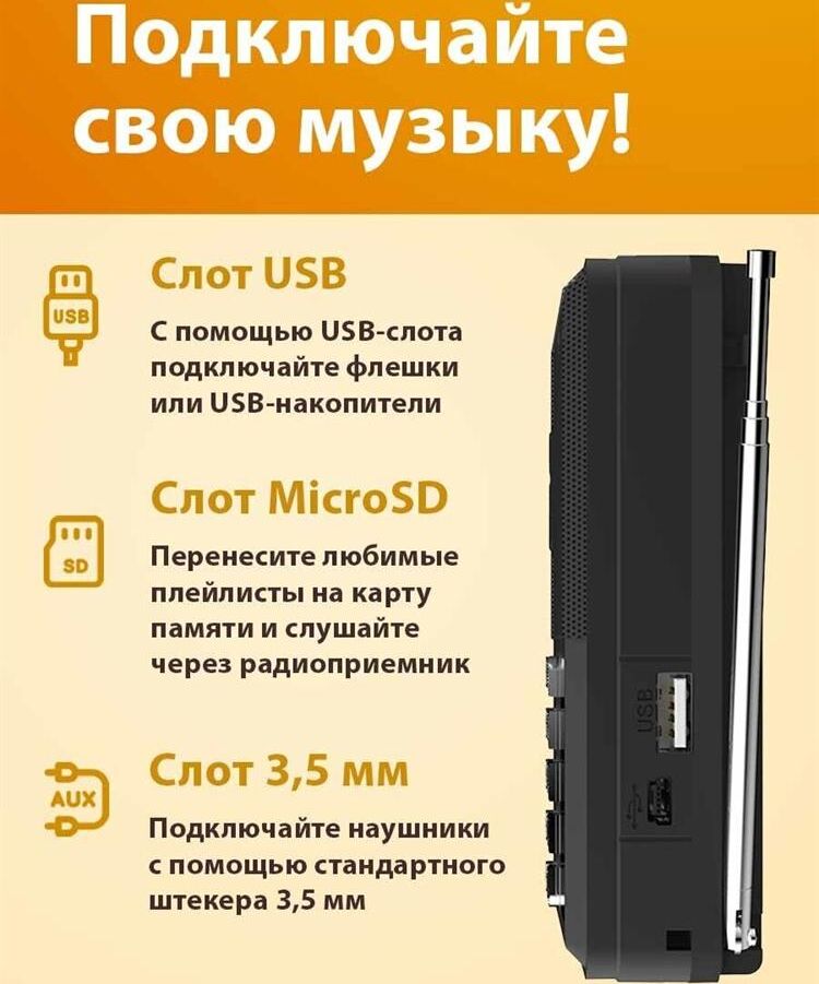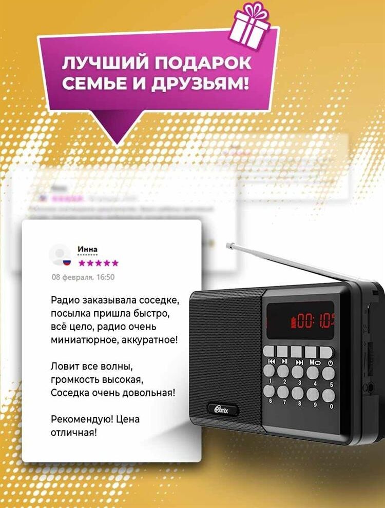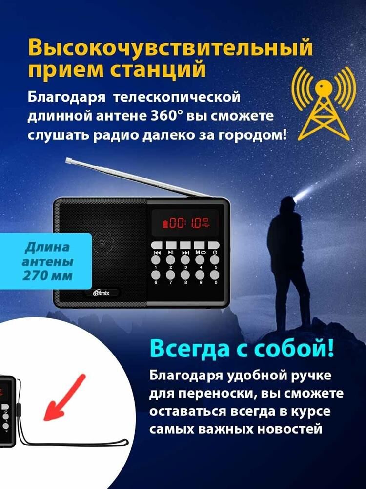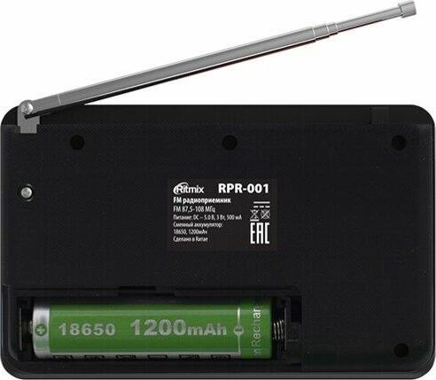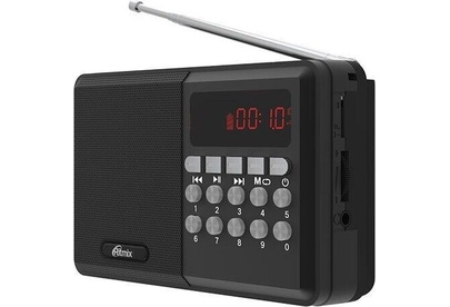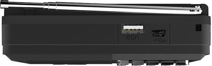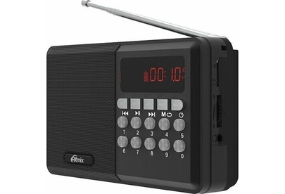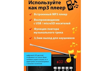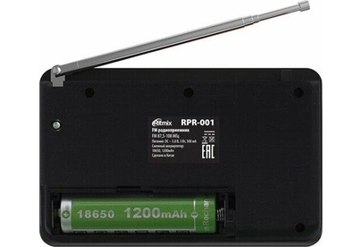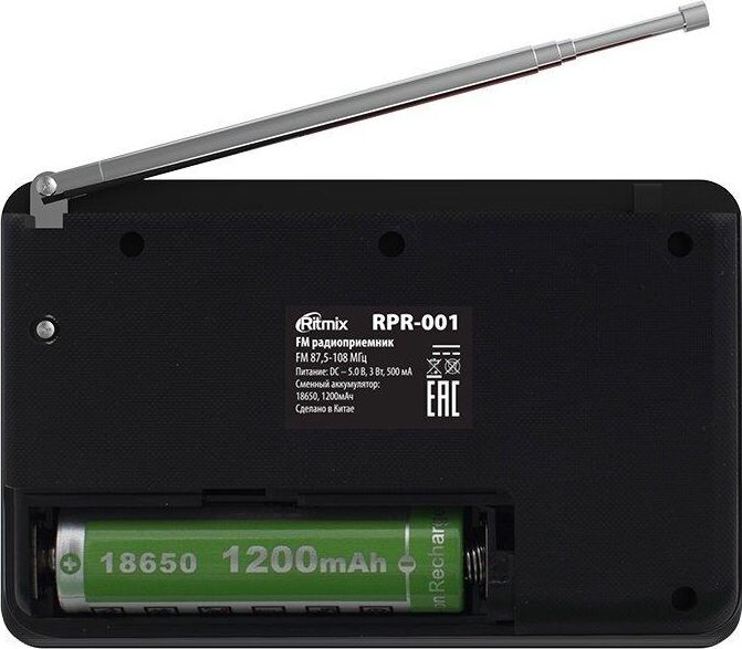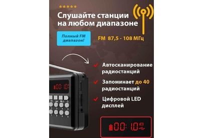 FM-радио, цвет: черный, FM (87,5 - 108 МГц), 1 динамик. Телескопическая антенна, ручка для переноски. Источник питания: AC 220V 50Hz / DC - 5,0 В, батарея Li-ion 18650