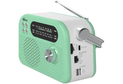Портативный трёхдиапазонный радиоприёмник с ручкой для переноски. Поддержка Bluetooth v.5.4 и режима MP3, воспроизведение с USB/micro SD карт, питание USB Type-C, сменный аккумулятор на 1200 мАч