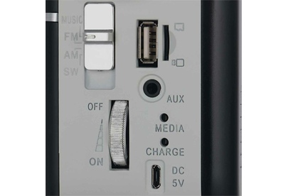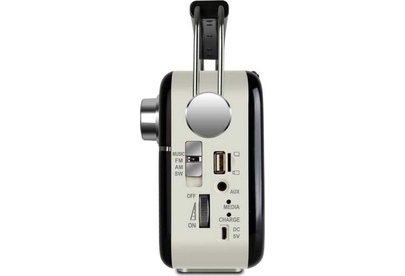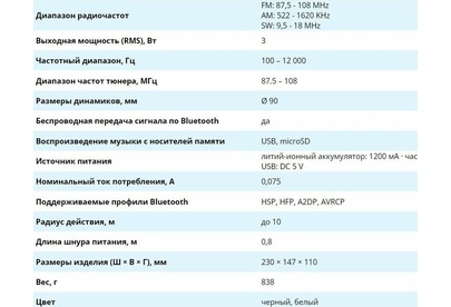 Портативная беспроводная акустическая система ,Bluetooth, выходная мощность (RMS) - 4Вт, частотный диапазон, Гц 100 – 12 000, размеры динамиков, мм - O 90, диапазон частот тюнера, МГц - 87.5 – 108, воспроизведение музыки с носителей памяти USB, microSD, источник питания - литий-ионный aккумулятор: 1200 мA · час, USB: DC 5 V, размеры изделия (мм) - 230х147х110.