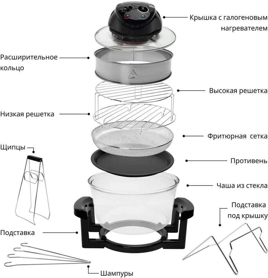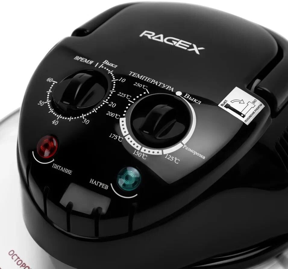 Многофункциональный аэрогриль R201-000 с механическим управлением и галогеновым нагревателем мощностью 1400 Вт станет незаменимым помощником на кухне. Устройство с основным объемом 12 л (расширяемым до 17 л с помощью кольца) из жаропрочного стекла и пластиковой крышкой позволяет готовить при температуре 65-250°С с таймером до 60 минут. 5 автоматических программ и технология циркуляции горячего воздуха обеспечивают идеальные результаты для различных блюд: от выпечки и гриля до приготовления на пару и сушки. Практичные функции включают индикаторы работы и нагрева, регулировку температуры, самоочистку, разморозку (при 100°C для равномерного оттаивания) и съемную крышку. В комплекте: расширительное кольцо, 4 шампура, 2 решетки, противень, фритюрная сетка, щипцы, подставка для крышки, руководство и две коробки (подарочная + транспортировочная). Идеально подходит для здорового приготовления без масла с сохранением сочности продуктов.