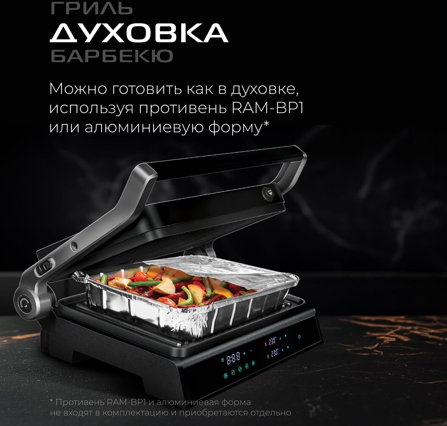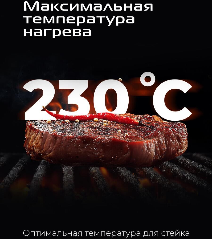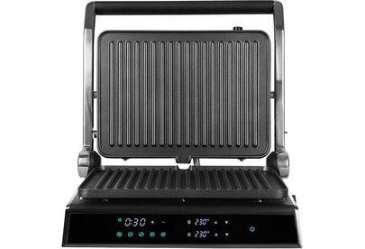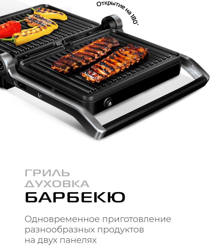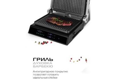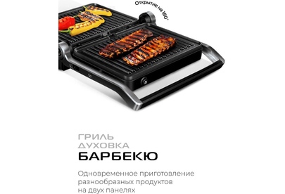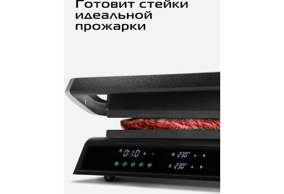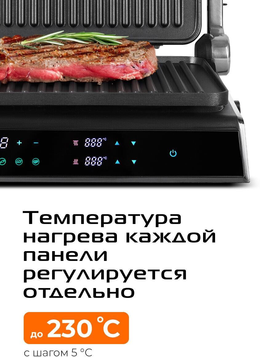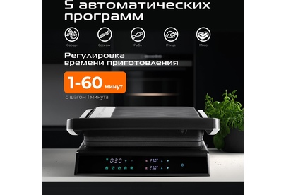 Количество программ/режимов: 5. Тип управления: сенсорное. Тип нагревательного элемента: ТЭН. Установка времени приготовления: есть. Ширина рабочей поверхности: 21.2. Длина рабочей поверхности: 29. Антипригарное покрытие нагревательных частей: есть. Список режимов/программ приготовления: Овощи;Сосиски;Рыба;Птица;Мясо. Установка температуры приготовления: есть. Информационный дисплей: есть. Лоток для сбора жира: есть. Индикатор включения: есть. Индикатор нагрева: есть. Звуковой сигнал: есть. Мойка рабочих поверхностей в посудомоечной машине: да. Вес товара: 4.4. Раздельная регулировка температуры для пластин: есть. Раскрытие на 180 градусов: есть. Длина электрокабеля: 0.8. Габариты упаковки (ед) ДхШхВ: 0.395x0.184x0.365. Вес упаковки (ед): 4.9. Страна производства: Китай. Гарантия: 12 мес.. Цвет: черный. Материал корпуса: пластик/металл. Размеры (ШхВхГ): 36 х 15 х 31.5см. Мощность: 1950 Вт. Температура: 90 - 230 °С. Нагревательный элемент: ТЭН. Мощность: 1950 Вт. Количество программ/режимов: 5. Особенности: ра