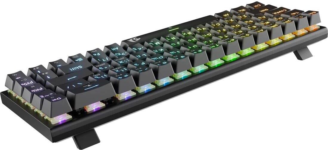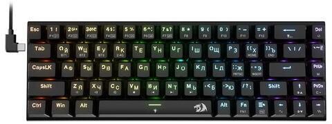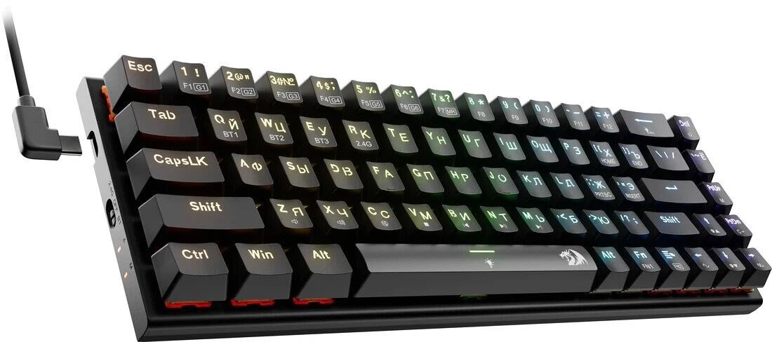Интерфейс: USB. Тип беспроводного соединения клавиатуры: Bluetooth/Радиоканал. Мультимедийные дополнительные клавиши: есть. Для геймеров: да. Обычная/тонкая: обычная. Подсветка клавиш: есть. Клавиатура с русскими буквами: ДА. Дизайн клавиш: квадратные. Длина кабеля: 1.8. Тип элементов питания: собственный аккумулятор. Максимальное время работы: нет. Цвет английских букв: прозрачный. Цвет русских букв: прозрачный. Вес: 0.65. Механическая: да. Тип соединения: беспроводная. Количество клавиш: 68. Тип подсветки: RGB. Тип механических переключателей: Redragon Maple. Габариты упаковки (ед) ДхШхВ: 0.36x0.155x0.065. Вес упаковки (ед): 0.65. Страна производитель: Китай. Гарантия: 18 мес.. Размеры клавиатуры (ШхВхТ): 310 х 34 х 104 мм. Цвет: и черный. Беспроводной интерфейс: Bluetooth/Радиоканал. Цвет английских букв: прозрачный. Конструктив: механическая. Цвет русских букв: прозрачный. Тип соединения: беспроводная. Особенности: мультимедийная, для геймеров. Встроено: подсветка клавиш. Интерфейс: USB