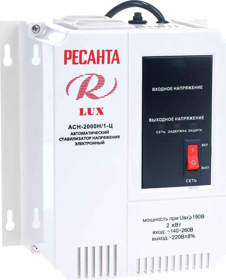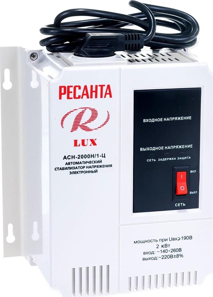 Номинальная мощность 2 000Вт, Тип двигателя Релейный, производство Китай, Серия АСН, Тип напряжения Однофазное (220 В), Размещение Настенноее, Скорость стабилизации 35В/с, Охлаждение Естественное, Класс защиты IP20, Влажность воздуха 80%, КПД 97%, Точность стабилизации 8%, Выходное напряжение 202-238В, Рабочая температура 5-40°C, Частота 50Гц, Выходные розетки-2, Защита от короткого замыкания, от перегрева, от повышенного напряжения, от помех