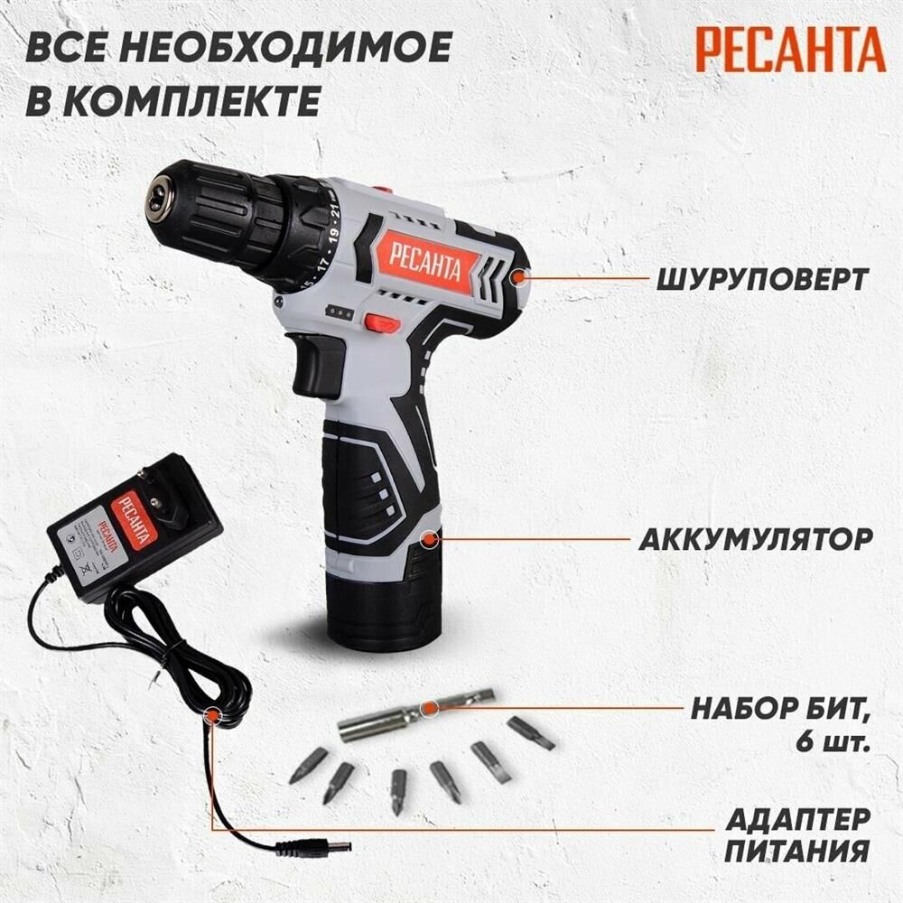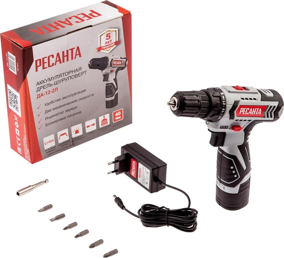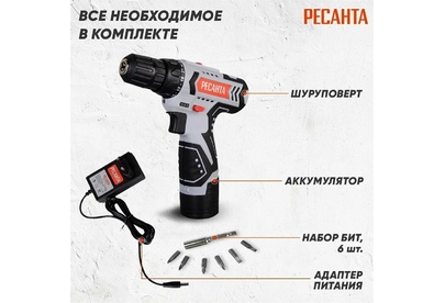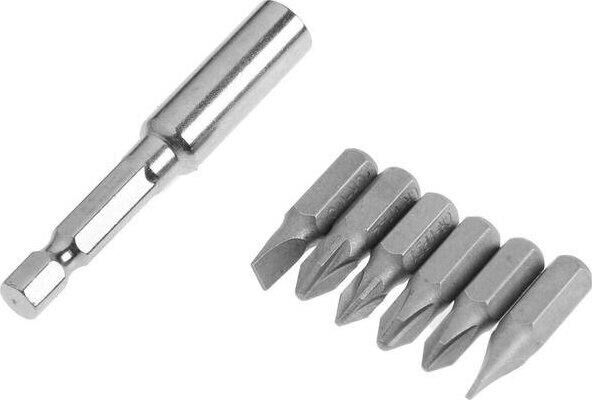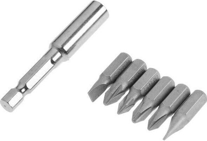 шуруповерт, адаптер питания, бита – 6 шт, удлинитель для бит, инструкция