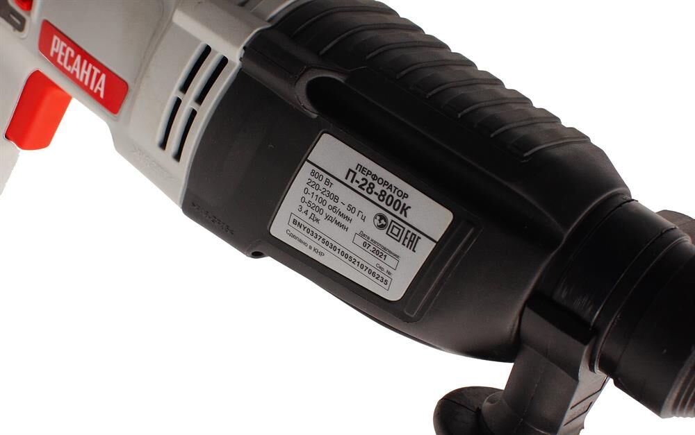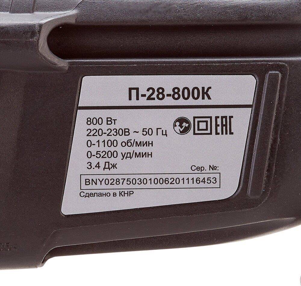 Номинальная мощность, Вт – 800. Частота вращения, об/мин – 0-1100. Сила удара, Дж – 3,4. Система зажима – SDS-plus.