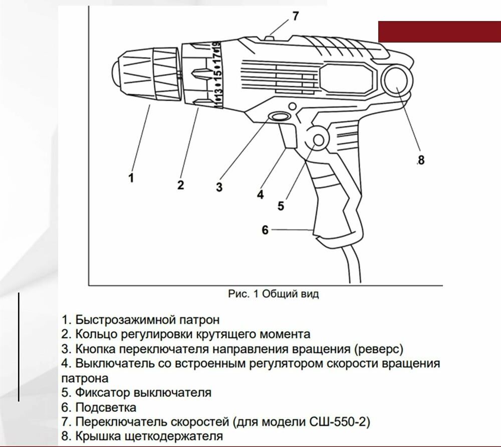 лампа точечной подсветки, блокировка кнопки включения, регулировка частоты вращения