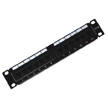 Патч-панель, на лицевой стороне панели - 12 гнезд RJ-45 , на тыльной стороне - контакты, для фиксированного соединения с кабелями, выполнена с однотипными разъемами – неэкранированными RJ-45 разъемами для кабелей категории 5е. Для фиксированного соединен