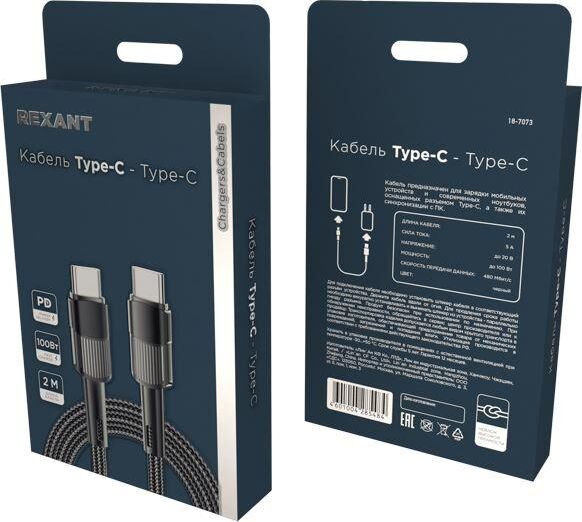 REXANT (18-7073) Type-C ? Type-C, 5A, 100Вт, 2м, в черной нейлоновой оплетке