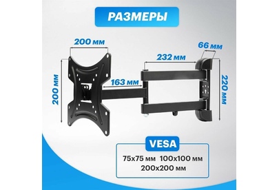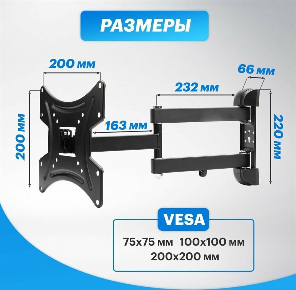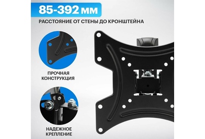 Кронштейн для телевизора. Тип: наклонно-поворотный Назначение: для тел-в Цвет: черный глянец Мин. диагональ: ТВ 17 Макс. диагональ: ТВ 42 Максимальный вес оборудования: 20 кг Угол наклона: -15°/+15° Угол поворота: 180° Установка: настенный Расстояние от стены до ТВ: 87-197 мм Поддержка крепления VESA 75х75 ДА Поддержка крепления VESA 100х100 ДА Поддержка крепления VESA 200х200 ДА