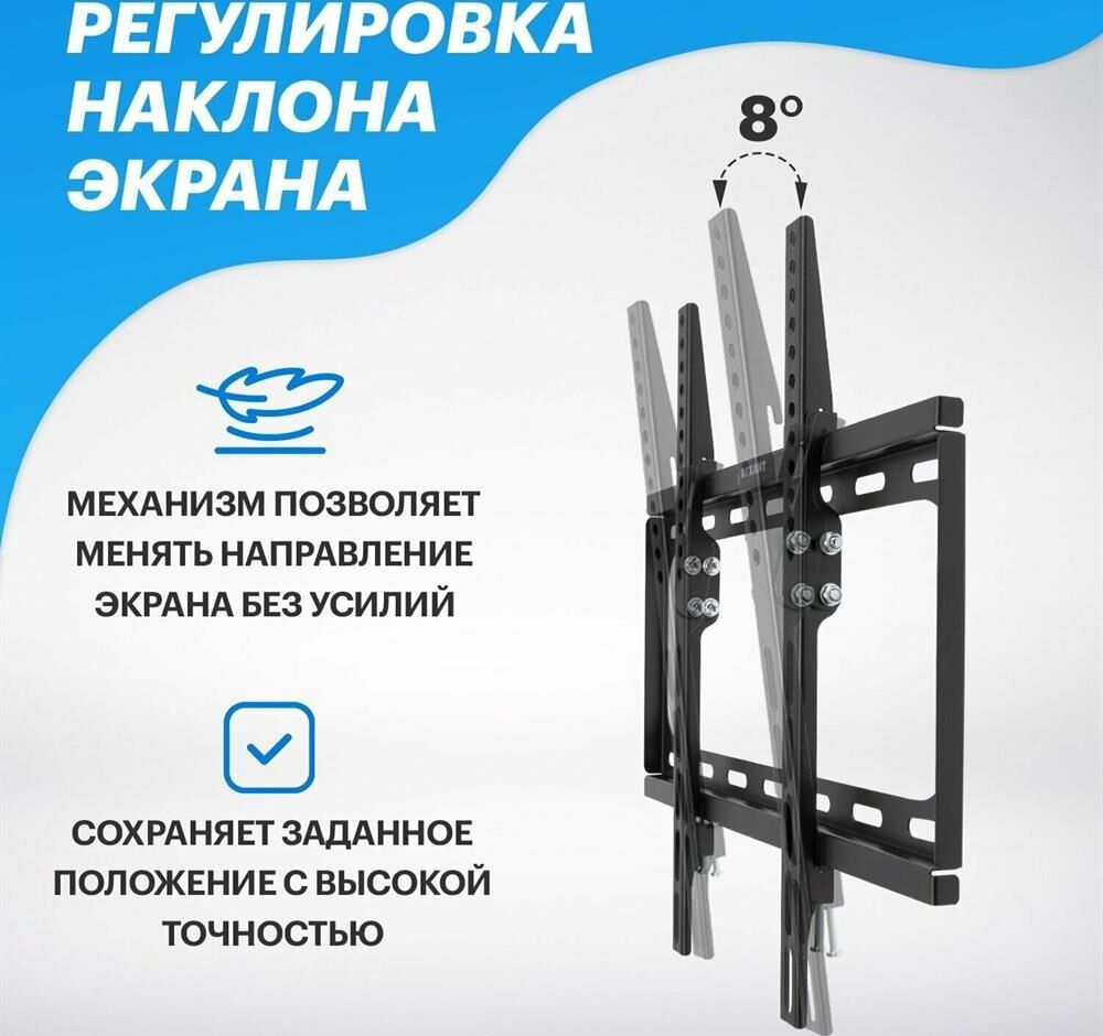 Кронштейн для телевизора. Тип: наклонный Цвет: черный глянец Мин. диагональ: ТВ 26 Макс. диагональ: ТВ 55 Максимальный вес оборудования: 30 кг Установка: настенный Расстояние от стены до кронштейна: 26 мм Поддержка крепления VESA 50х50: да Поддержка крепления VESA 75х75: да Поддержка крепления VESA 100х100: да Поддержка крепления VESA 200х100: да Поддержка крепления VESA 200х200: да Поддержка крепления VESA 300х200: да Поддержка крепления VESA 400х200: да Поддержка крепления VESA 300х300: да Поддержка крепления VESA 400х400: да Угол наклона -0°/+10°