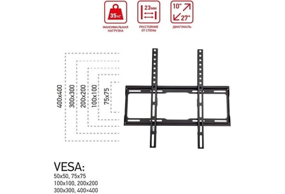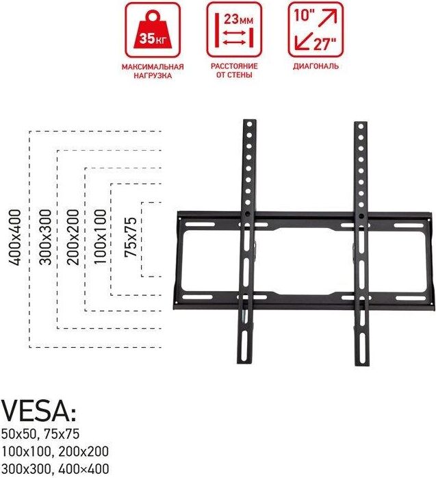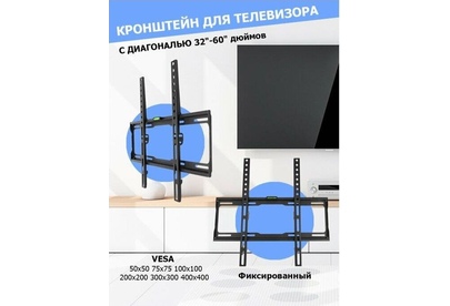Кронштейн на стену для телевизора, диагональю: 30"-60 " дюймов, REXANT серия HOME Тип: фиксированный Назначение: для LED/LCD/PLASMA тел-в Цвет: черный Мин. диагональ: ТВ 32 дюймов Макс. диагональ: ТВ 60 дюймов Максимальный вес оборудования: 35 кг Тип монтажа: настенный Расстояние от стены до кронштейна: 23 мм Поддержка крепления стандарта VESA: 50x50/75х75 /100х100/200x200/300x300/400x400 Крепление: в комплекте.