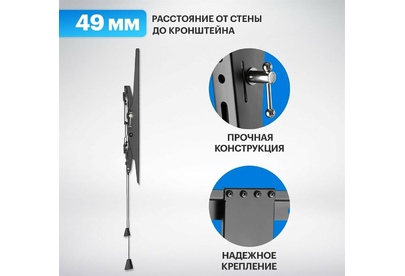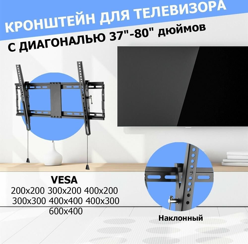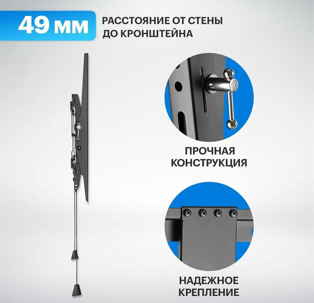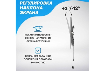 Тип: наклонный Назначение: для LED/LCD/PLASMA телевизоров и мониторов Цвет: черный Мин. диагональ: ТВ 37 дюйма Макс. диагональ: ТВ 80 дюймов Наклон: 3°-12° Максимальный вес оборудования: 70 кг Тип монтажа: настенный Расстояние от стены до кронштейна: 49 мм Поддержка крепления стандарта VESA: 200x200, 300x200, 300x300, 400x200, 400x300, 400x400, 600x400 Пузырьковый уровень: в комплекте Крепление: в комплекте С механизмом быстрой фиксации на защелках