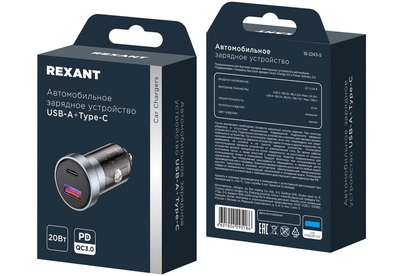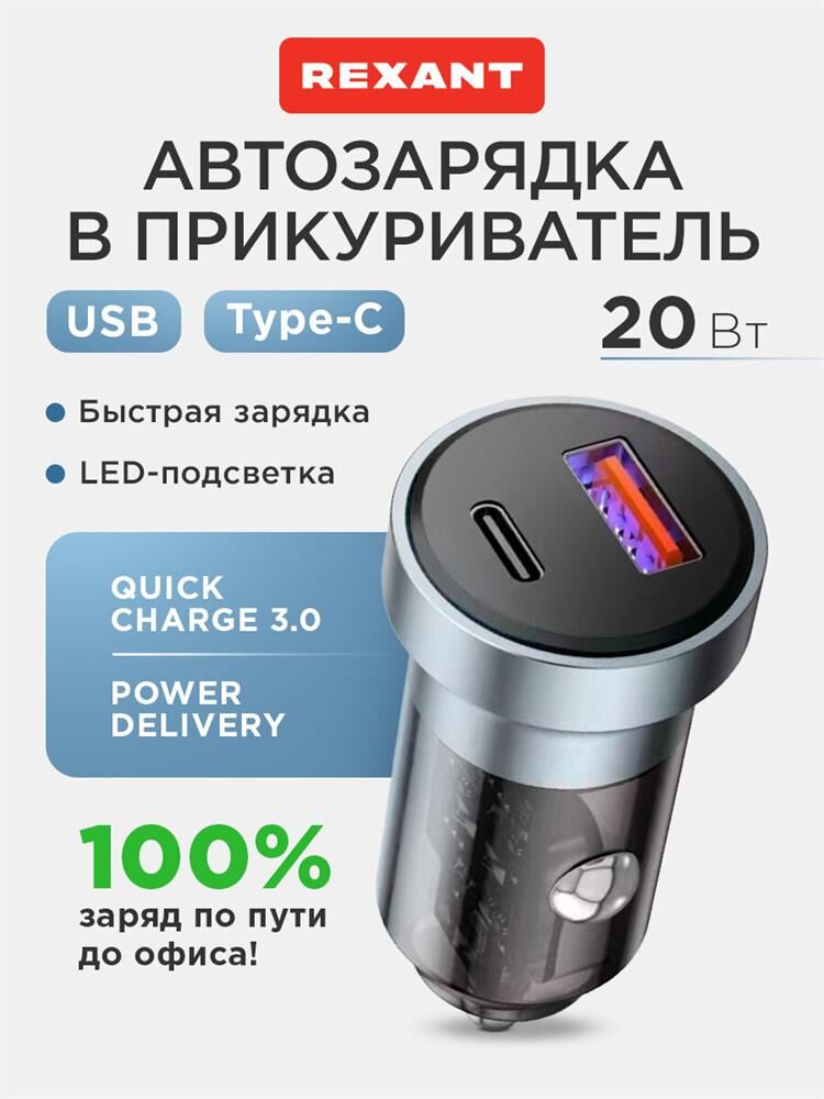 REXANT Автомобильное зарядное устройство c двумя портами (USB-A + USB-C) c LED-подсветкой, 20Вт
