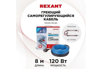 REXANT Кабель греющий саморегулирующийся модель SRL 15MSR-PB, на трубу, 8м/120Вт
