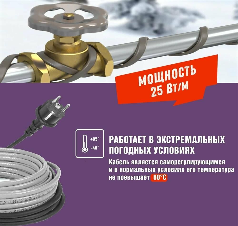 REXANT Кабель греющий саморегулирующийся модель SRL Extra Line 25MSR-PB, на трубу, 10м/250Вт