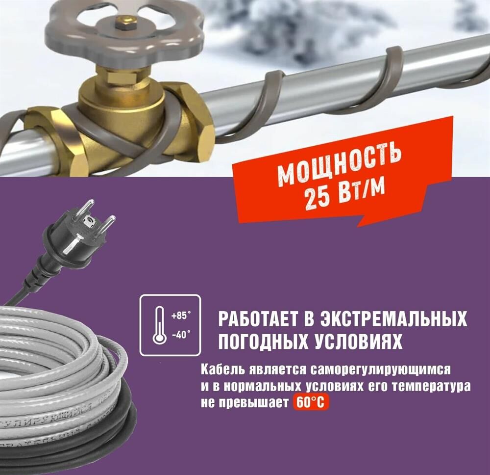 REXANT Кабель греющий саморегулирующийся модель SRL Extra Line 25MSR-PB, на трубу, 3м/75Вт