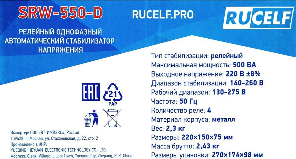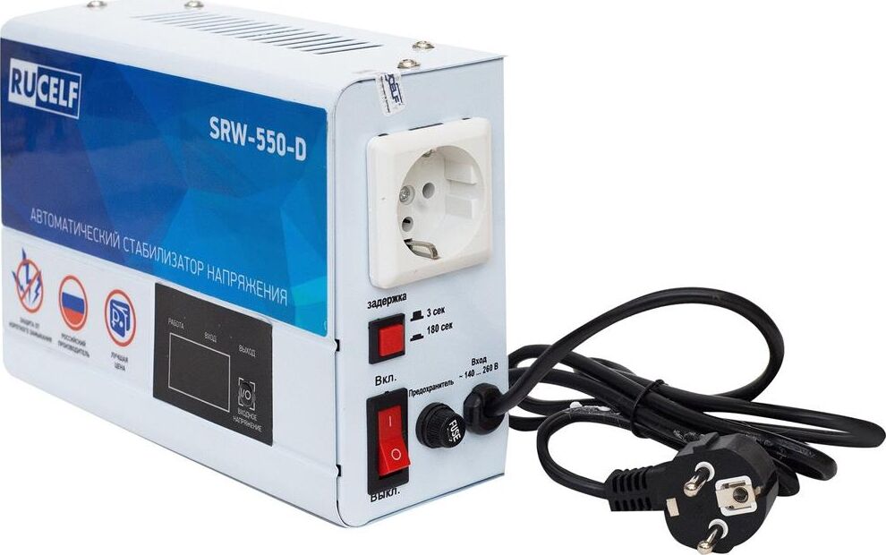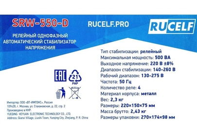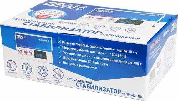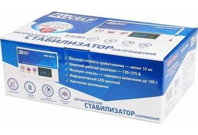 Тип стабилизации: Релейный. Мощность: 500 ВА. Диапазон стабилизации: 140-260 В. Рабочий диапазон: 130-275 В. Точность стабилизации: ±8%. Количество реле: 4. Частота: 50 Гц. Материал корпуса: металл. Кнопка выбора задержки выходного напряжения: есть (3 или 180 с). Габаритные размеры: 220х150х75 мм. Вес: 2,3 кг.