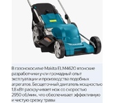 Газонокосилка Makita ELM4620 предназначена для ухода за газоном площадью от 800 до 1000 кв.м. Высоту рукоятки можно отрегулировать под пользователя любого роста. Один рычаг позволяет изменять высоту скоса от 20 до 75 мм. Количество положений скашивания - 8. Травосборник, рассчитанный на 60 л отходов, не требует частого опустошения. Также контейнер оснащен индикатором наполнения. Технические характеристики Makita ELM4620 Вес, кг 23,4 Габариты, мм 1700х570х1165 Ширина скашивания, см 46 Мульчирование есть Самоходная нет Травосборник есть Площадь, м? 1000 Система передачи прямая Асинхронный двигатель да Кол-во режимов регулировки высоты 8 Мощность (кВт) 1,8 Регулировка высоты центральная Тип травосборника мягкий с жестким верхом Высота скашивания max, мм 75 Высота скашивания min, мм 20 Материал корпуса нержавеющая сталь Объем травосборника, л 60 Тип ручки регулируемая, складная Тип двигателя электрически