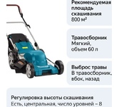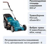 Тип двигателя: электрический. Режущая система: 0. Ширина скашивания: 46. Тип выброса травы: задний выброс в травосборник, боковой выброс. Тип травосборника: мягкий. Объем травосборника: 55. Мульчирование: есть. Ручки для транспортировки: есть. Складная ручка: есть. Регулировка ручки по высоте: есть. Количество колес: четырехколесная. Защита от перегрузки: нет. Тип электропитания: от аккумулятора. Емкость аккумулятора: 4. Напряжение аккумулятора: 40. Вес товара: 24.5. Тип передвижения: несамоходное. Рекомендуемая площадь скашивания: 800. Аккумулятор в комплекте: есть. Зарядное устройство в комплекте: есть. Габариты упаковки (ед) ДхШхВ: 0.83x0.56x0.431. Вес упаковки (ед): 16.8. Гарантия: 24 мес.. Высота скашивания: 25 - 80 мм. Регулировка высоты скашивания: есть, (центральная). Ширина скашивания: 46 см. Объем травосборника: 55 л. Аккумулятор: 4 Ач, 40 В. Вес: 24.5 кг. Режущая система: 0. Выброс травы: задний выброс в травосборник, боковой выброс. Двигатель: электрический