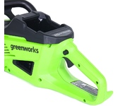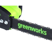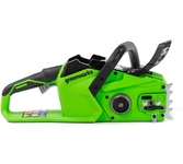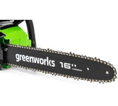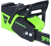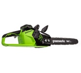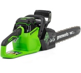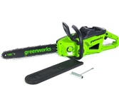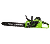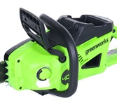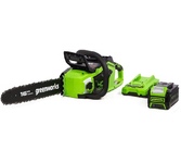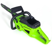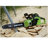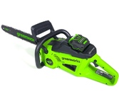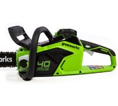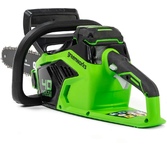 Цепная аккумуляторная пила GreenWorks 40 вольт (модель GD40CS18) - полупрофессиональная цепная пила, которая отлично подойдет для полноценного ведения дачного хозяйства. Ее надежный бесщеточный двигатель сопоставим по мощности с бензиновыми аналогами на 1,9 л/сил. При этом электродвигатель пилы GreenWorks абсолютно экологичен, имеет высокий крутящий момент (пилит быстрее бензинового аналога)