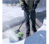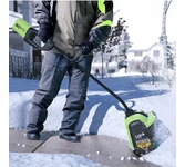 Для эксплуатации на ровных поверхностях со свежим рыхлым снегом, высотой до 27 см. Очистит небольшую площадь до 20м2. Имеет одноступенчатый шнек (диаметр 13 см) из армированного пластика и ковш (36,5х27 см). Подойдет для работы на площадке с декоративным покрытием или садовых дорожках. Работает на двух одновременно подключённых аккумуляторах системы UES. Средняя продолжительность работы снегоуборщика на двух аккумуляторах — до 20 минут. Электрический двигатель мощностью 0,85 кВт. Максимальная частота вращения шнека 1800 об/мин. Дальность выброса снега может доходить до 6 метров. Расстояние варьируется от температуры, влажности воздуха, а также типа снега (рыхлый, мягкий). На ковше располагается рычаг, который регулирует направление выброса снега. Складная рукоятка и небольшие габариты для транспортировки в машине или хранения в багажнике. Малый вес (9,69 кг). Два аккумулятора (20V MAX, 4 А*ч) и зарядное устройство на два слота в комплекте.