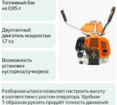 Двигатель 2-х тактный, с воздушным охлаждением. Тип зажигания Электронный. Обороты двигателя, об/мин 9500±500. Защитные очки Есть. Антивибрационная система ПРОФ Да. Ширина скоса диском, мм 255. Ширина скоса леской, мм 460. Уровень звукового давления, дБ 96. Тип ремня СТ. Тип катушки Стандартная. Разъемная штанга Да. Габариты упаковки 0.31х 0.32х 0.23 м. Вес, кг 9.038 кг .