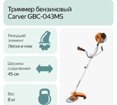 Мощность 1050/1,43 Вт/л.с; Объем двигателя 31 см3; топливный бак 0,75 л; 8500 об/мин; велосипедная рукоятка; неразборная штанга; кошение кордом 440 мм; кошение ножом 255 мм; Уровень мощности звука 110 дБ, вес нетто 6,2 кг