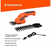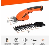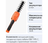 Частота ходов: 1100. Длина основного ножа для кустов: 160. Ширина ножа для травы: 80. Тип электропитания: от аккумулятора. Емкость аккумулятора: 1.5. Напряжение аккумулятора: 7.2. Тип аккумулятора: Li-Ion. Продолжительность работы от аккумулятора: 20. Время зарядки, около: 120. Индикатор заряда батареи: есть. Антиблокировочная система: нет. Защитное устройство ножа: нет. Защитный тормоз: нет. Ножи с алмазной заточкой: нет. Смена ножей без инструмента: есть. Комплект ножниц для травы и кустов: есть. Длина инструмента: 324. Высота инструмента: 125. Вес товара: 0.99. Комплект поставки: Ножницы садовые, кабель для зарядки Type-C, АКБ (встроен), сменные насадки (1 насадка установлена) – 2 шт., руководство по эксплуатации.. Аккумулятор в комплекте: есть. Зарядное устройство в комплекте: есть. Габариты упаковки (ед) ДхШхВ: 0.33x0.11x0.13. Вес упаковки (ед): 1.37. Страна производства: Китай. Гарантия: 12 мес.. Аккумулятор: Li-Ion, 7.2 В; 1.5 Ач. Частота ходов: 1100 ход/мин. Электропитание: от аккумулятора. Длина осно