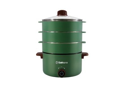 800Вт, многофункциональная электрическая пароварка (готовит на пару, тушит, жарит, варит, стерилизует), регулируемая мощность 400Вт /800Вт, 3 паровые корзины из нержавеющей стали, общий объем 8л, чаша с антипригарным покрытием 1,2л, двухслойный корпус: металл + пластик, диаметр внутренний 22,5см, внешний – 23см, высота 1 корзины: 6.5 см, глубина чаши: 9 см, крышка из закаленного стекла с паровыводящим отверстием, механическое управление, защита от перегрева, цвет корпуса: зеленый. Длина шнура: 0,8 м. Размеры прибора: 37*29,5см