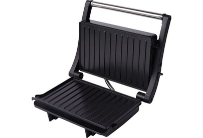 Гриль электрический, мощность 1000Вт, 2 рифленые панели для жарки, размер панели 23.1х14.6 см, антипригарное покрытие, открытие панелей на 180° (возможность приготовления на 2 пластинах одновременно), индикатор работы, прорезиненные ножки. Корпус из нержавеющей стали и термостойкого пластика.