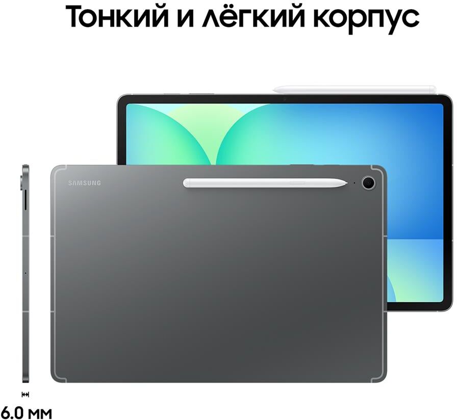 Диагональ экрана: 10.9. Тип экрана: TFT. Объем оперативной памяти: 12. Объем встроенной памяти: 256. Поддержка карт памяти: microSD. Максимальный объем карт памяти: 1024. Операционная система: Android 15. Запись видео: 4К. Фронтальная камера: есть. Поддержка аудиоформатов: MP3, M4A, 3GA, AAC, OGG, OGA, WAV, AMR, AWB, FLAC, MID, MIDI, XMF, MXMF, IMY, RTTTL, RTX, OTA. Поддержка видеоформатов: MP4, M4V, 3GP, 3G2, AVI, FLV, MKV, WEBM. Емкость аккумулятора: 8000. Вес товара: 497. Цвет: серый. Дополнительно в комплекте: Стилус. Яркость экрана: 800. Число ядер процессора: 8-ядерный. Тип аккумулятора: Li-Pol. Время работы при воспроизведении видео: 20. Комплект поставки: Планшет, электронное перо S Pen, кабель Type-C (m) - Type-C (m), скрепка для извлечения лотка, документация. Защита от пыли и влаги: есть. Тип разрешения экрана: WUXGA+. Разъемов USB Type-C: 1. Соотношение сторон экрана: 16:10. Габариты упаковки (ед) ДхШхВ: 0.272x0.183x0.02. Вес упаковки (ед): 0.77. Число пикселей на дюйм: 249. Версия USB Type-C: 2.0