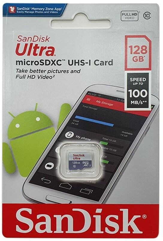 128GB Карта памяти MicroSD SANDISK Class 10 Ultra UHS-I (100 Mb/s) без адаптера (SDSQUNR-128G-GN3MN). Карта памяти microSD SanDisk Ultra поможет расширить дисковое пространство вашего смартфона, планшета, камеры или другой мультимедийной техники. На ней помещается большое количество документов, музыки и фильмов, кроме того, она подходит для хранения и записи видео в формате Full HD.