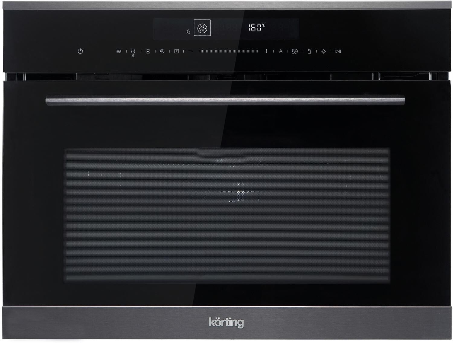 Компактный духовой шкаф с функцией СВЧ, высота прибора 45 см, электронное сенсорное управление Full TouchControl, LЕD дисплей белого цвета Cold White, 10 режимов нагрева духовки, 4 режима СВЧ, включая 3 комбинированных режима; автопрограммы, электронный таймер отключения и отложенного старта, дверца духового шкафа с тройным остеклением, система автоматического охлаждения, автоматическое отключение, эмаль легкой очистки, Аксессуары: противень для выпечки с внутренней решеткой, хромированная решетка, стеклянный противень, цвет: черное стекло + черная нержавеющая сталь