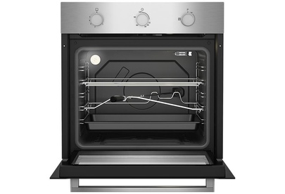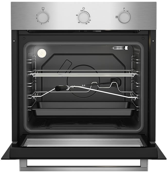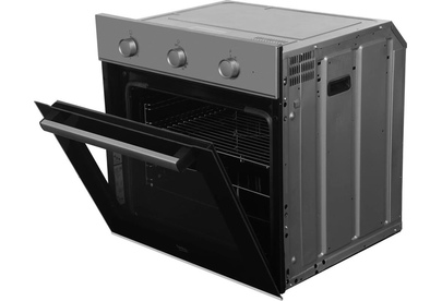 Размеры без упаковки (ВхШхГ), см - 59,5x59,4x56,7. Газовый духовой шкаф с откидным электрическим грилем; автоматический электроподжиг; поворотные переключатели; металлические направляющие; объем - 72л; 3 стекла дверцы; 1 решетка; 1 противень; вертел. Цвет: Нержавеющая сталь; Материал панели управления: Металл